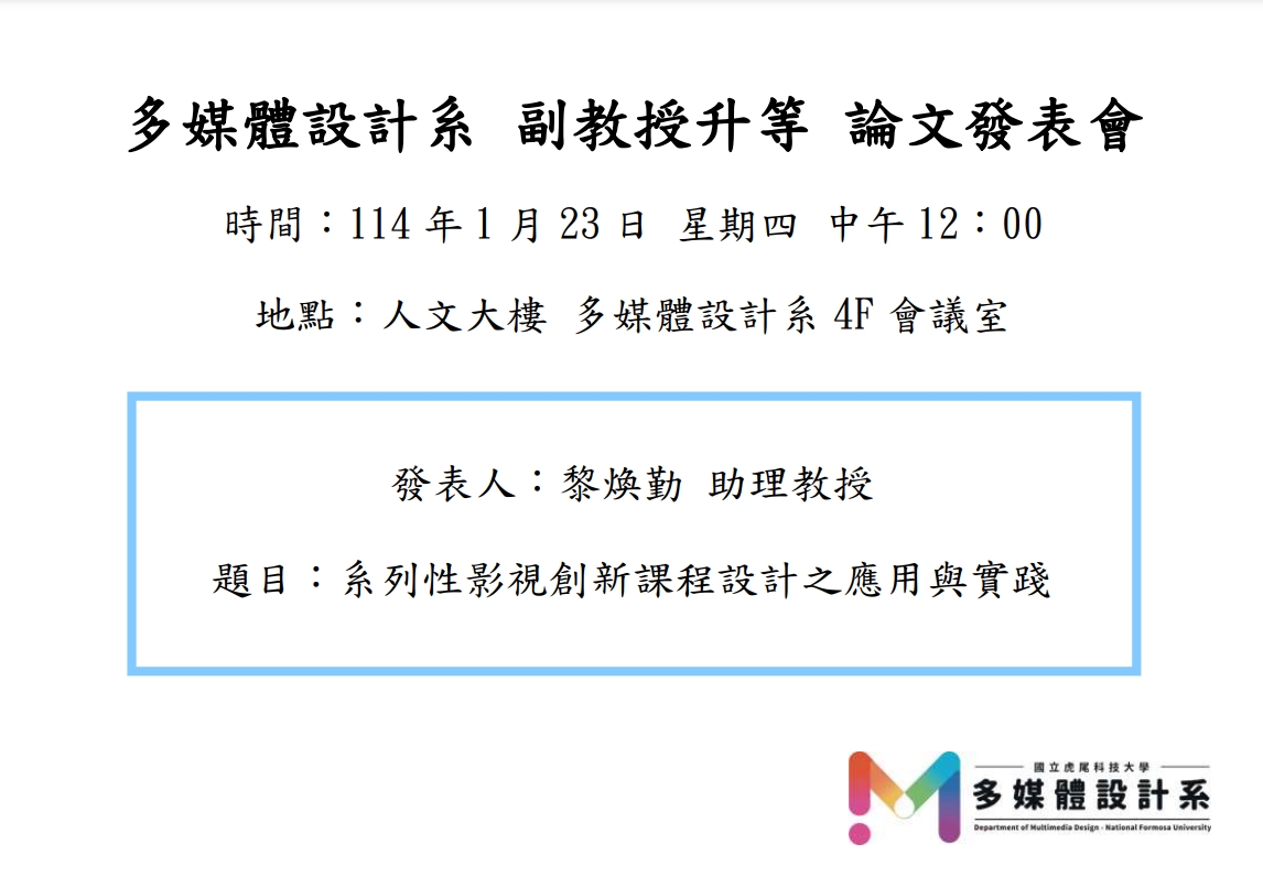 由 mmdesign 在 四, 01/16/2025 - 13:45 發表 代表著作主題:系列性影視創新課程設計之應用與實踐 發表人: 黎煥勤 助理教授 日期:114年1月23日 (星期四) 中午12:00 地點:第三校區 人文大樓 四樓 多媒體設計系會議室 ~~歡迎有興趣的師生踴躍參加~~