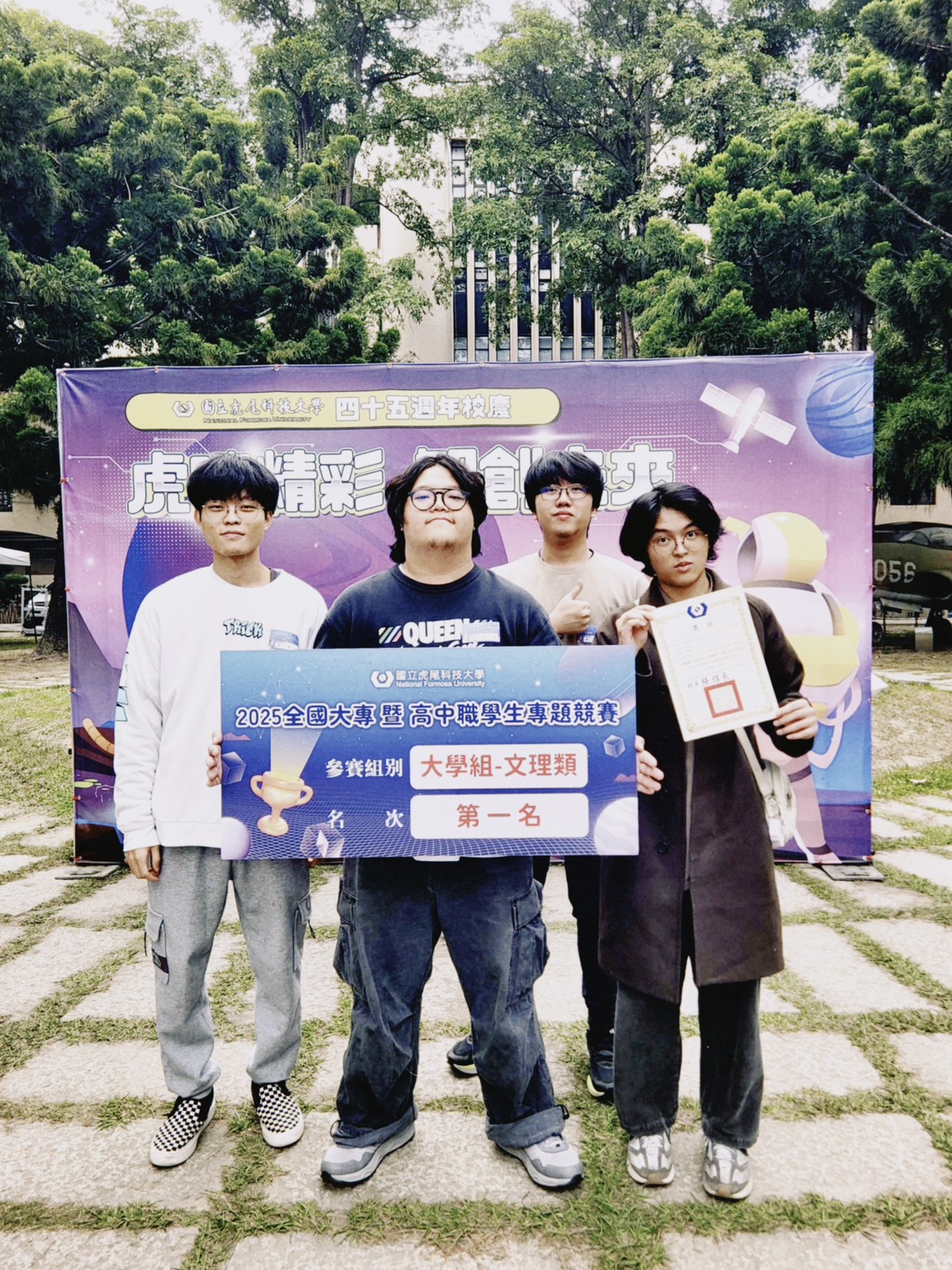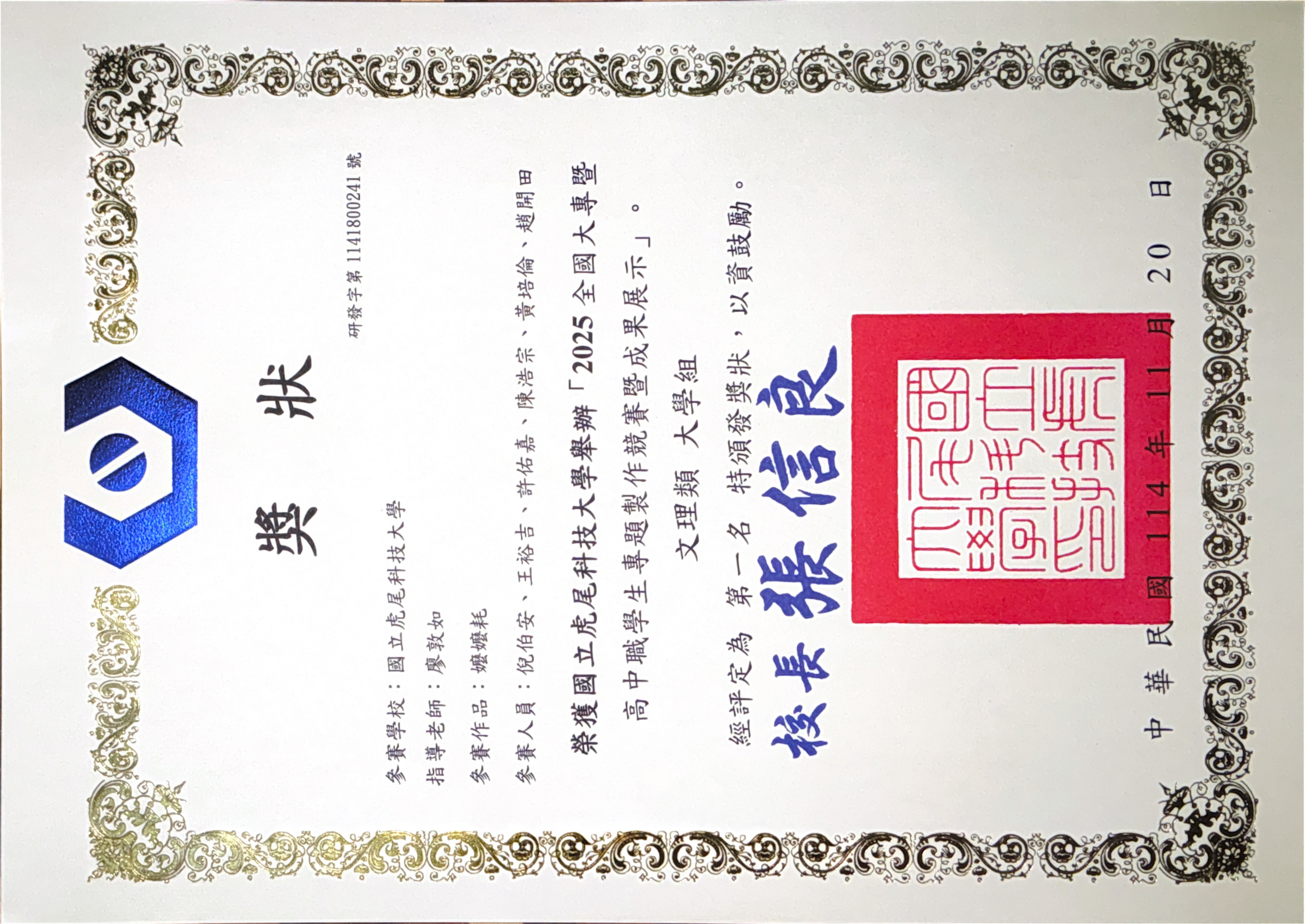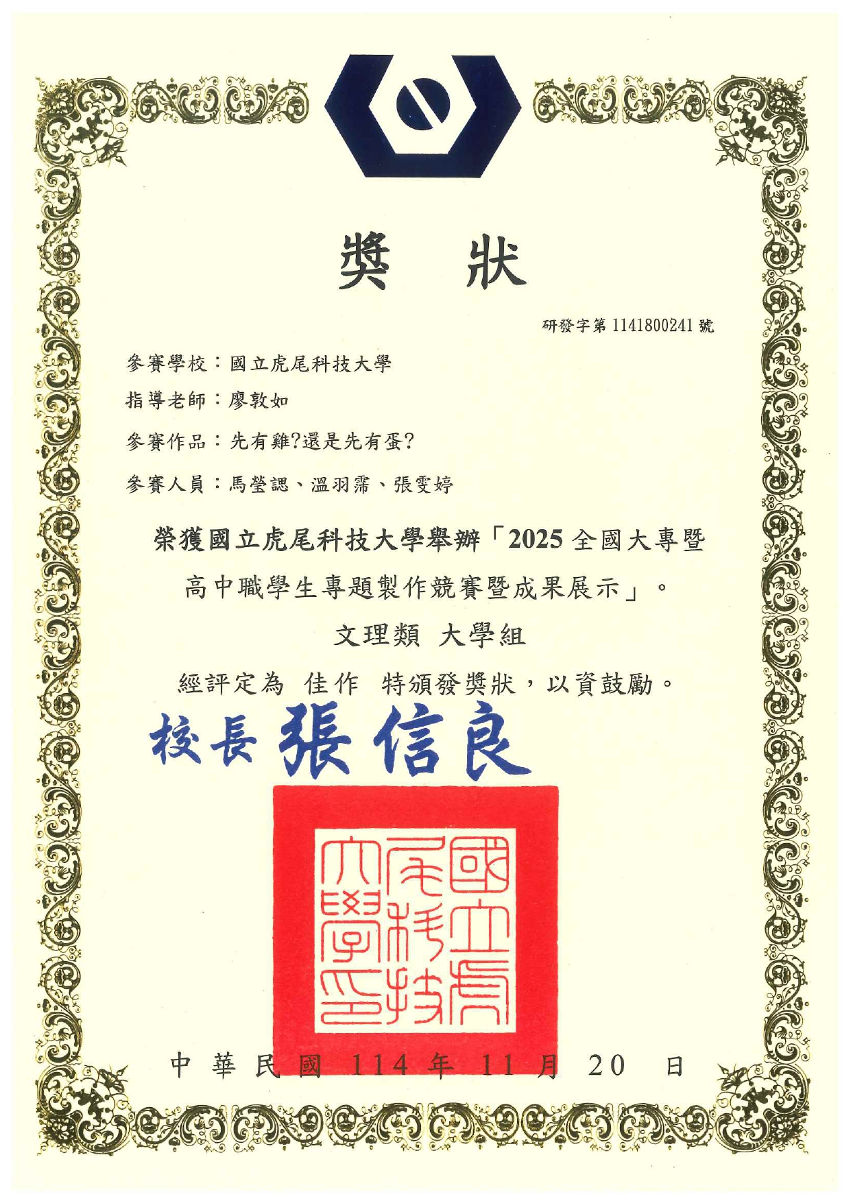 由 mmdesign01 在 四, 11/27/2025 - 14:33 發表 【2025年全國大專及高中職學生專題競賽】 賀!!本系專題組在大學組文理類的眾多組別中,脫穎而出!! ▲ 四技組「嬤嬤耗」,榮獲第一名 專題學生:倪伯安、許佑嘉、陳浩宗、黃培倫、趙開田、王裕吉 指導老師:廖敦如老師 ▲ 二技組「先有雞?還是先有蛋?」,榮獲佳作 專題學生:馬瑩諰、張雯婷、溫羽霈 指導老師:廖敦如老師