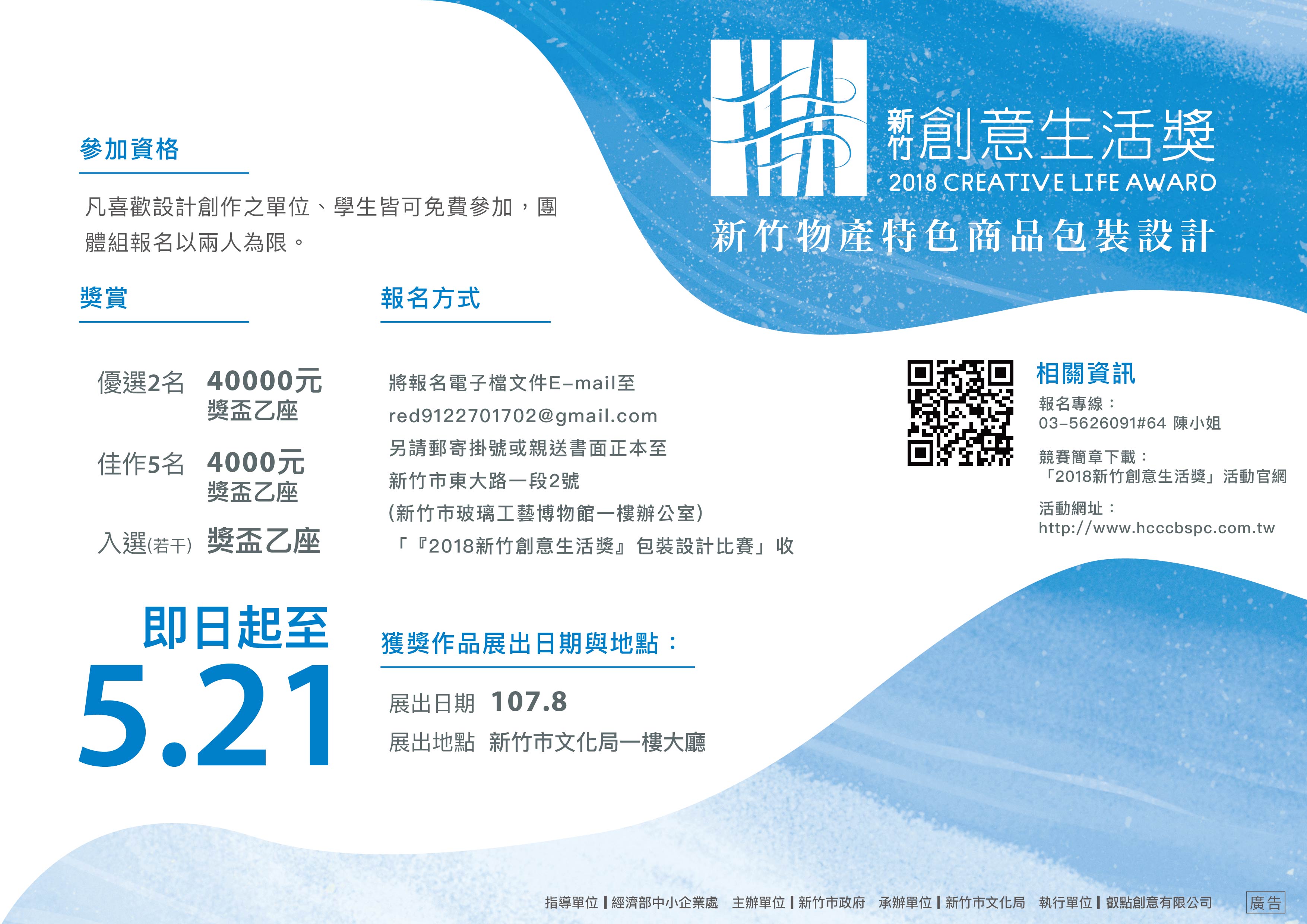 為形塑新竹市城市品牌意象,以設計力、美學力及文化力為本市各級生活工藝產業加值,辦理「2018新竹創意生活獎」包裝設計比賽,邀請全台設計好手一起為新竹設計,激盪專屬新竹地區獨特的設計火花。