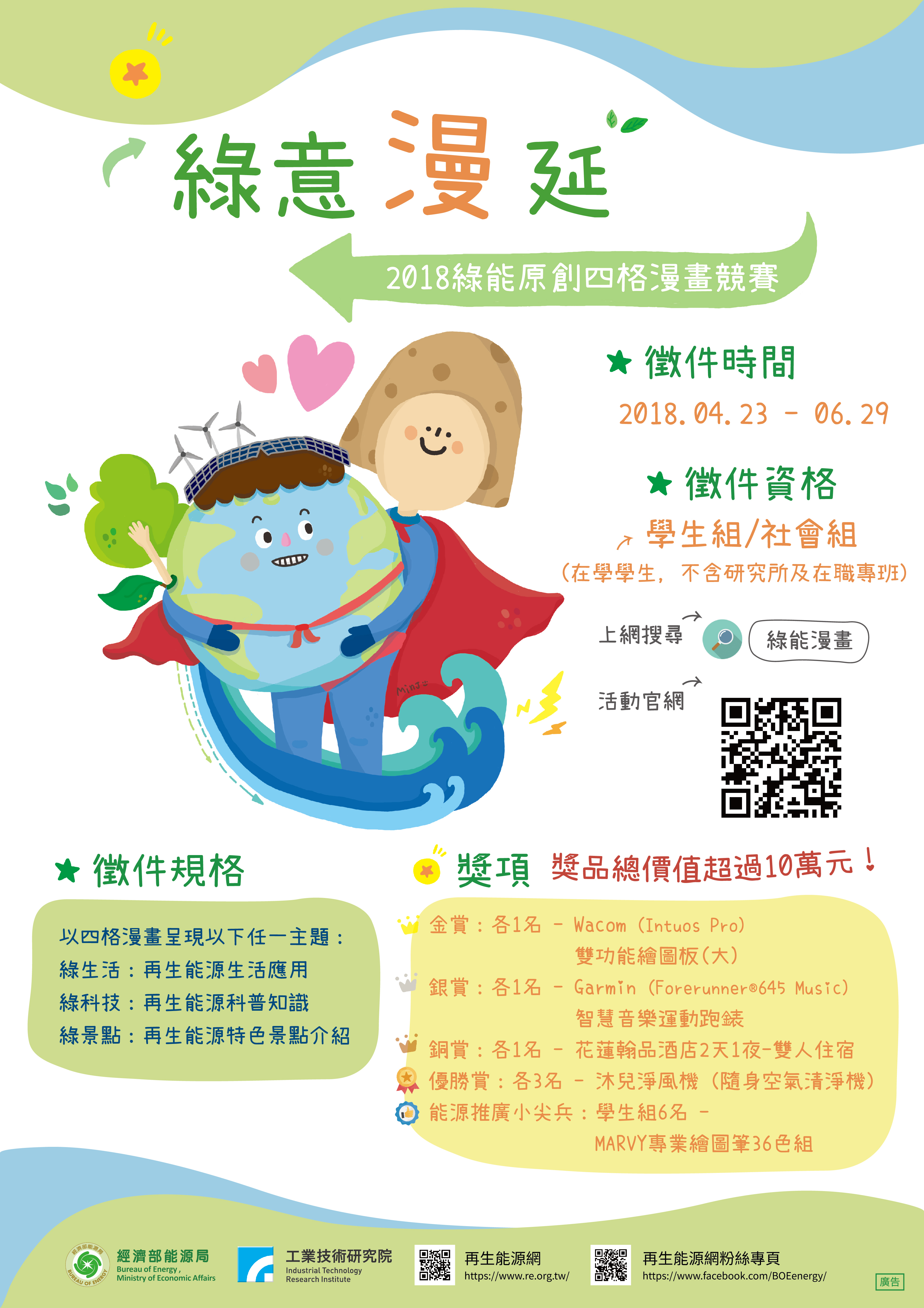 為提高國人關注再生能源資訊及強化再生能源認識與熟稔度,特辦理綠能原創四格漫畫競賽活動,希望透過趣味、幽默、詼諧的四格漫畫,促使各年齡層對艱深的再生能源議題產生興趣。另期望透過民眾的創意發想及參與,以活潑及深入淺出的方式,宣導再生能源生活圈的理念。