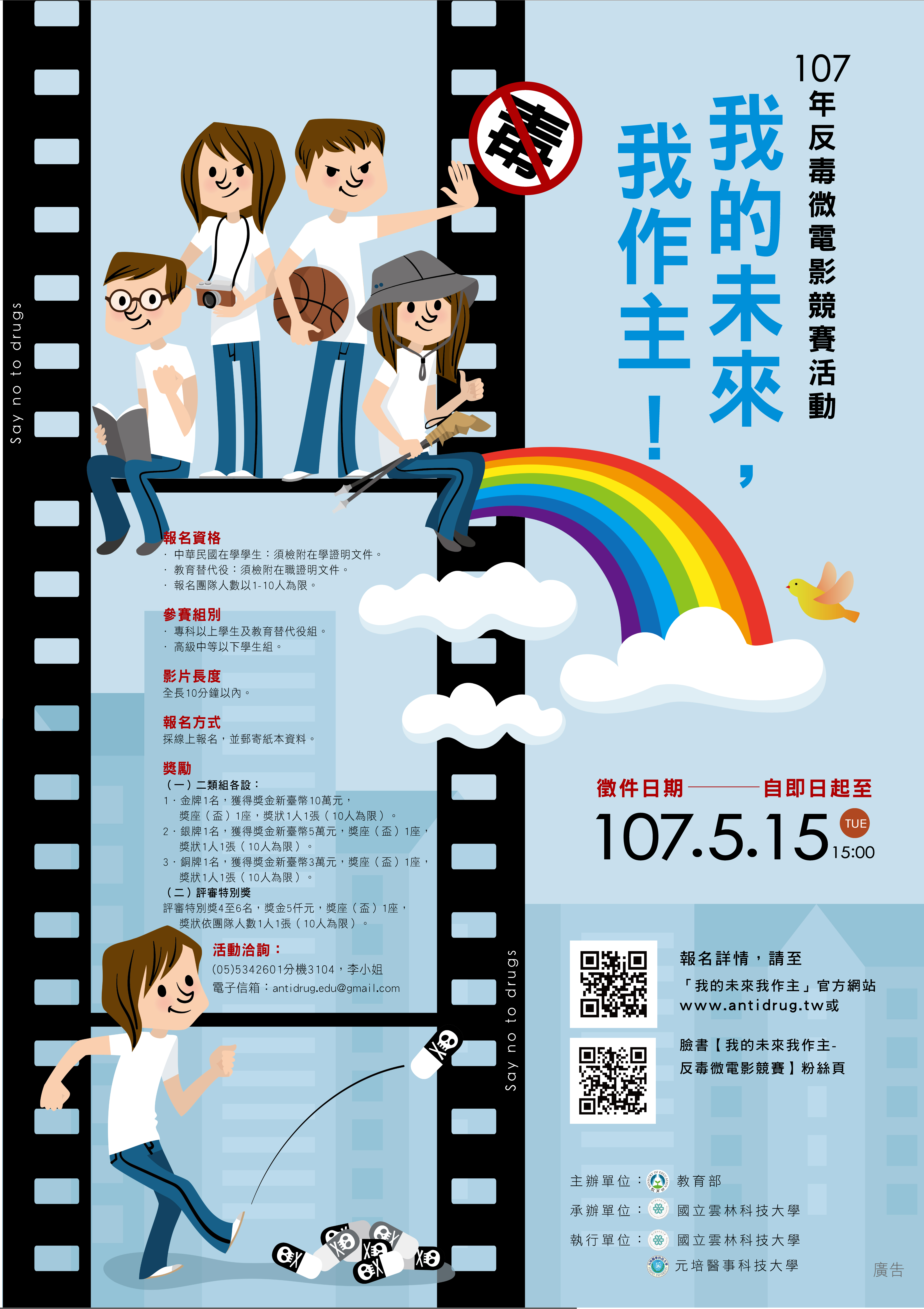 現今新興毒品猖獗,為免學生因好奇心、受同儕鼓動或其他因素,在未正確認識毒品及得知毒品危害前,不小心誤用毒品,造成令人遺憾且無可挽救之悲劇,教育部特辦理微電影競賽活動,使學生了解毒品濫用之危害而自我省思及覺察,進而遠離毒品、拒絕毒品,並鼓勵學生以活潑生動的正面態度拍攝微電影,讓學生創意發想,並透過同儕的力量一起向毒品說NO,既能使學生瞭解毒品的可怕,更能達到宣導反毒的正面效果。